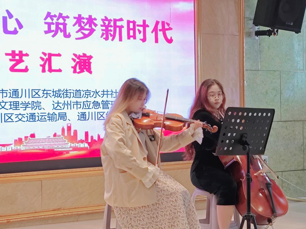 活动中,我校师生发挥自身专业优势,为社区群众带去精彩文艺表演,赢得了现场观众的阵阵掌声和社区居民的好评。舞蹈《奔腾》用丰富的身体语言,展现了蒙古人民豪放、奔放的性格,表达了人民对生活的热爱和向往。歌曲《有多远》旋律悠扬,唱出了在外漂泊的游子对家乡、父母、亲人的思念。提琴演奏《蒲公英的约定》以诗意的旋律给人们带来心灵上的丝丝温情和慰藉。